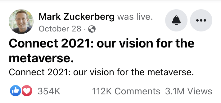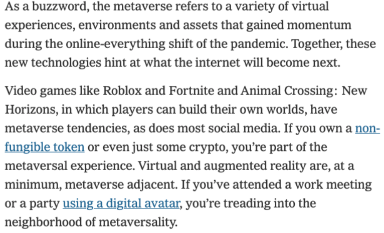 What it is: The metaverse is the next jump in the internet. It’s when your physical and digital life totally blur into a single augmented, virtual, crypto, creator-and-app centered, reality.