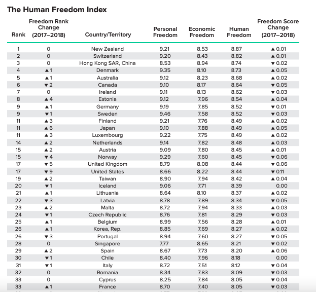 Fifth, the best examples of mixed countries for the US to examine while trying to get the balance right are Switzerland, the Nordics, Germany, Singapore, and Australia/Canada/NZ. I personally think the UN HDI and the Cato Human Freedom Index are among the best measures of prosperity, as these are complex and have much research showing that you can capture principal components of prosperity with a few factors. The US is in the low teens for both – top performers are Switzerland, Ireland, HK (though this will drop due to recent events), Denmark, and NZ/Australia. See the tables below. Steinberg’s “Why Switzerland” is probably the most interesting political economy book that no one reads.