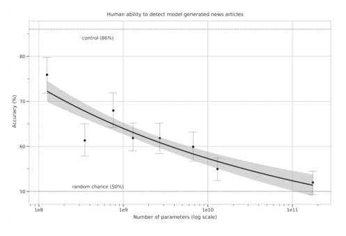 The major technical advance between GPT-3 and other language model predecessors is that GPT-3 can infer the task from just zero, one, or a few examples. This is a huge step forward in generalization. Existing and previous models all relied on task-specific tuning, which means a group of scientists and engineers getting a narrow dataset for a task and spending a few weeks or months to optimize the model for that task. Then the model is only useful for the one task. GPT-3 can be “primed” merely by giving it instructions in plain English – any human can do it. One of its scary abilities is that it can generate fake news articles which most humans cannot tell apart from a “real” human generated one. The chart below shows humans can only tell the two apart at a 52% rate, slightly above random chance and parity (the dot on the far right shows GPT-3 versus prior models at fooling humans).